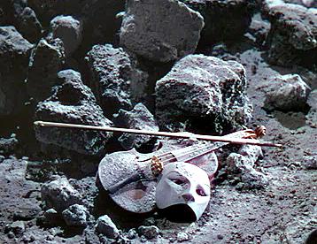 during a production where the actors wore similar masks. Erique's mask is seen next to his violin on a pile of rubble after his supposed death.